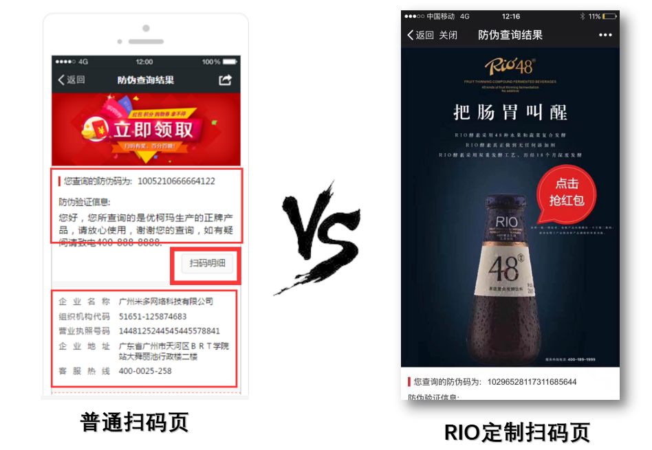 消費(fèi)者掃碼即可推送防偽結(jié)果及公司資質(zhì),建立企業(yè)公信力,樹立企業(yè)良好形象;